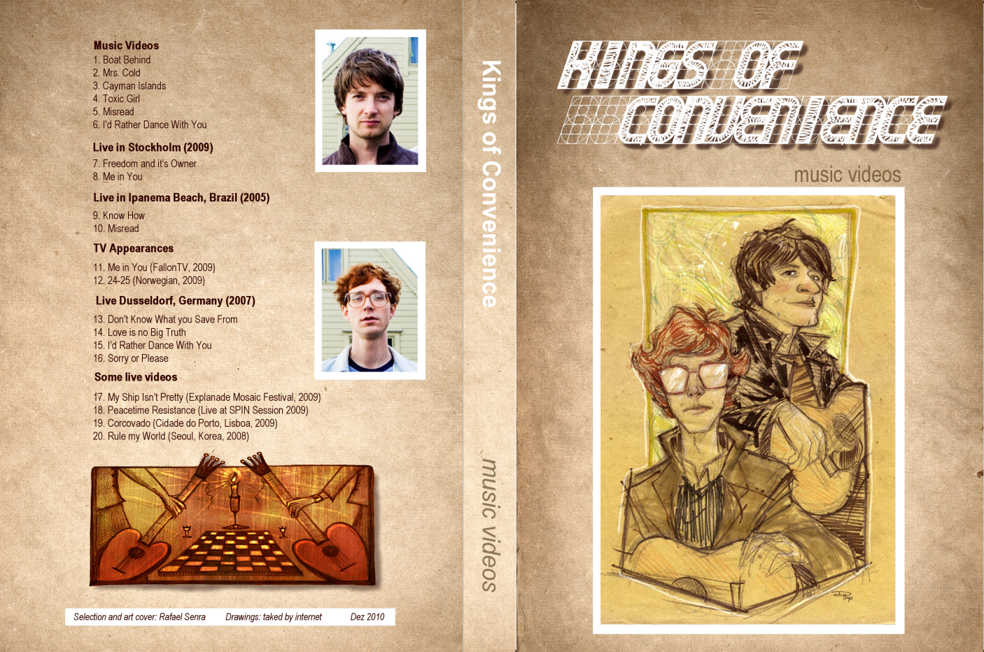 Quando fui fazer a capa do Kings of Convenience, por exemplo, eu tinha idéias pré-concebidas do que queria fazer. Nada muito definido, mas havia pensado em algumas coisas. Entretanto, ao procurar as imagens para a capa, me deparei com dois desenhos tão bons, que eles acabaram mudando todos os meus planos. Foram feitos por fãs aparentemente “anônimos”, mas muito talentosos. E ambos tem uma tonalidade meio marrom, meio amadeirada. Como gostei deles, acabei criando a capa baseada nessa tonalidade de cor.
